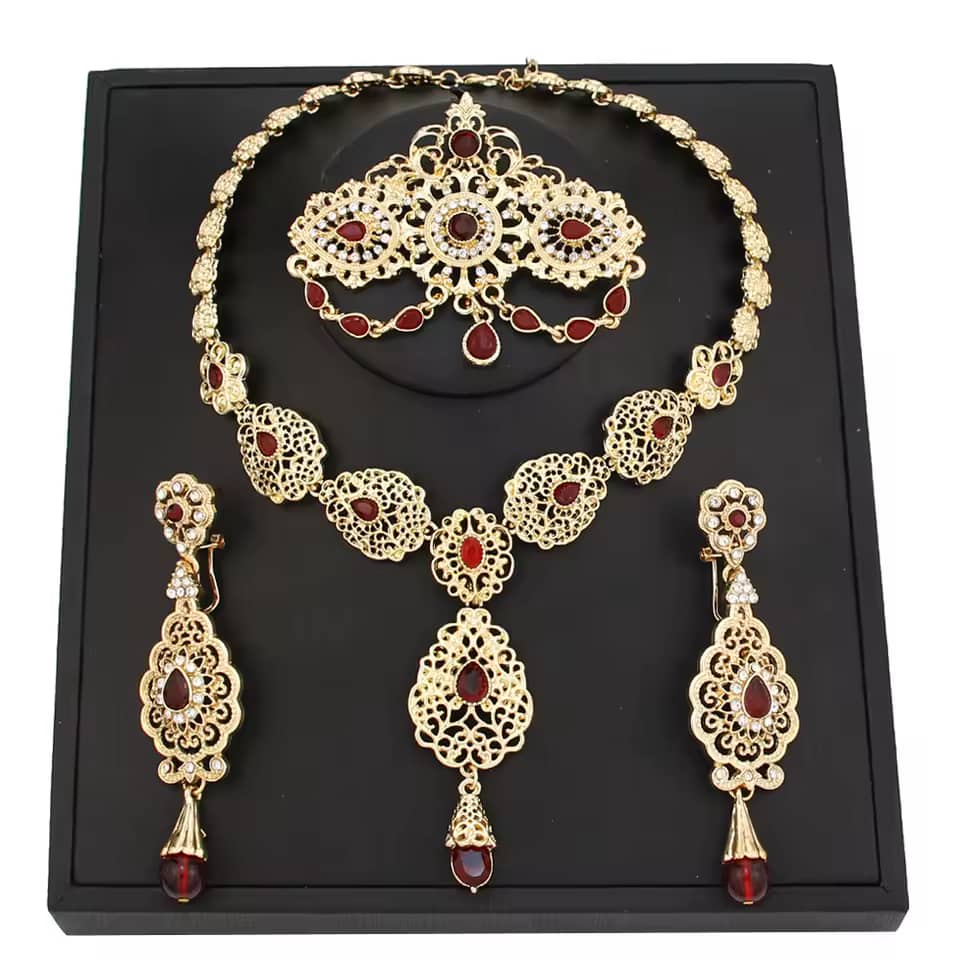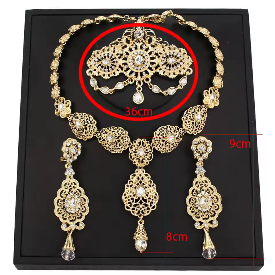 This Elegant Gold Plated Crystal Jewelry Set is the perfect accessory for special occasions. Featuring beautifully detailed designs with sparkling crystals, this set includes a necklace, earrings, and a crown, all crafted with high-quality gold plating for a timeless look. Ideal for weddings, galas, or any event that requires a bit of glamour, this jewelry set will enhance your beauty and confidence.