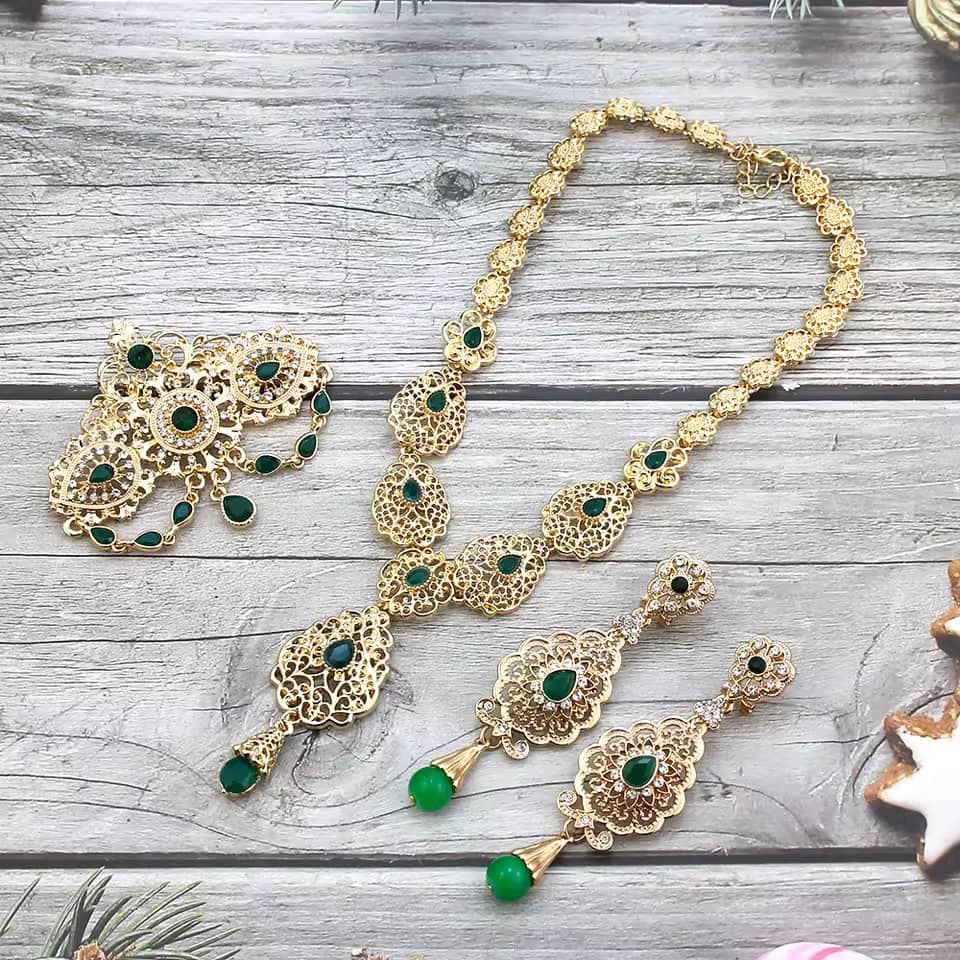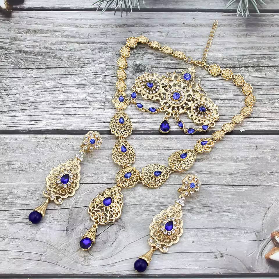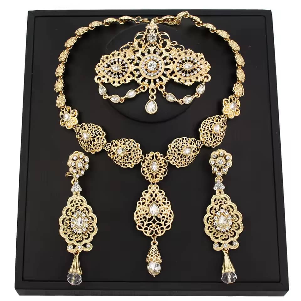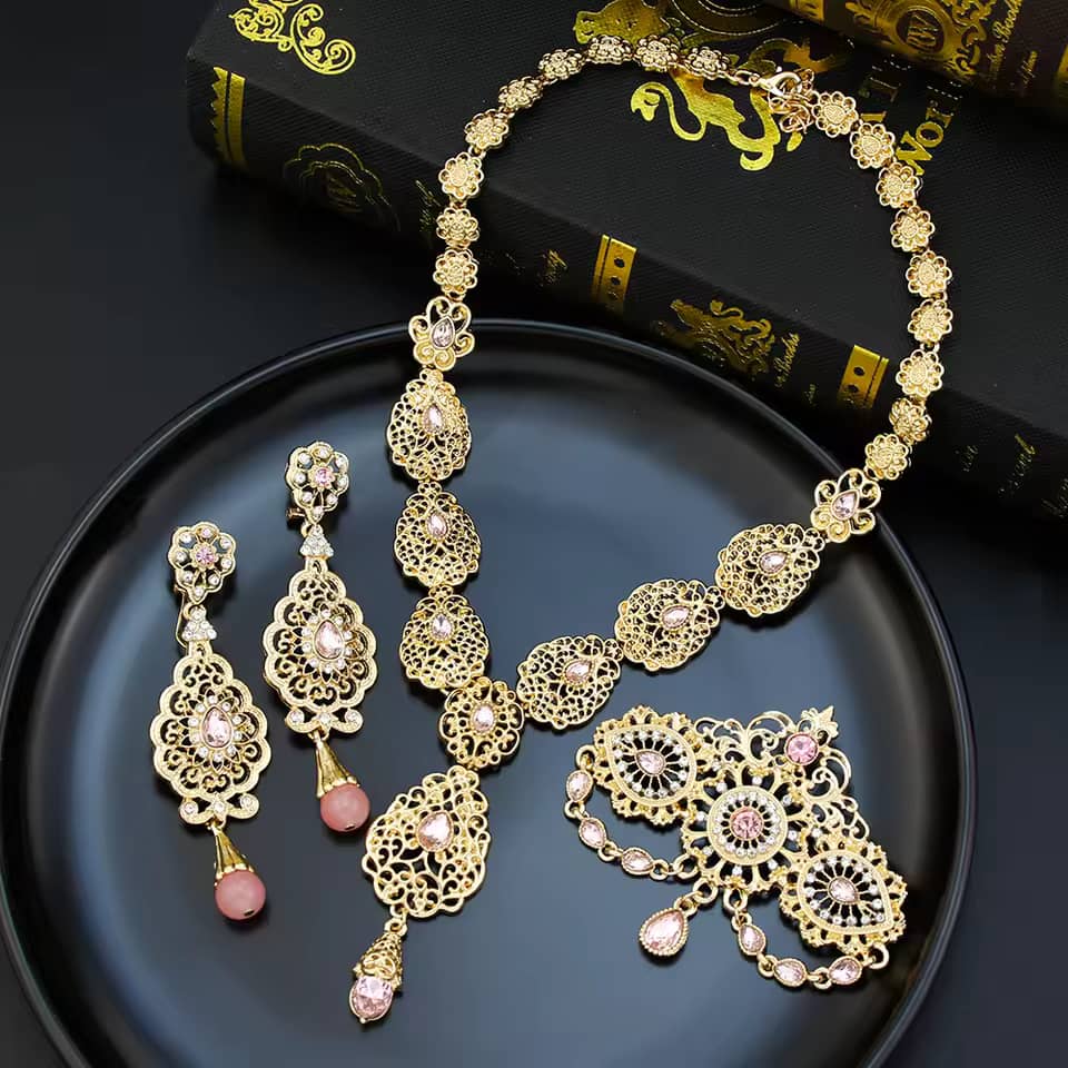 Add a touch of elegance with this luxurious gold-plated jewelry set featuring sparkling crystals and intricate designs.