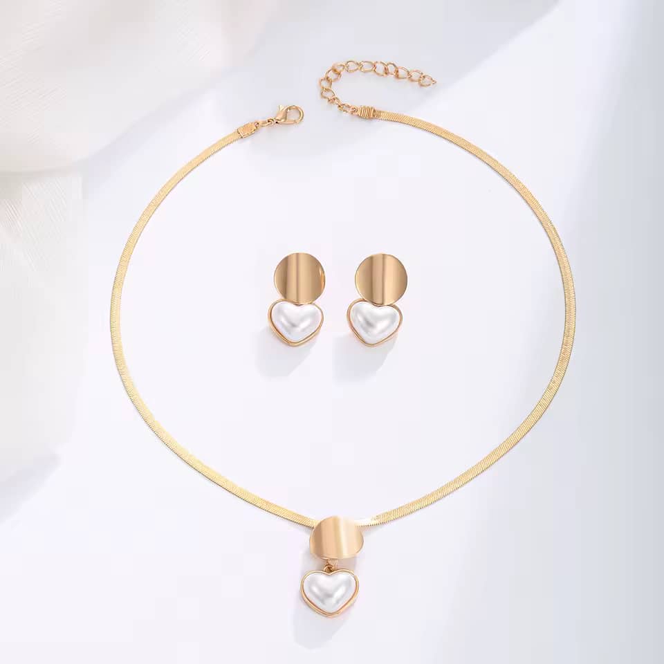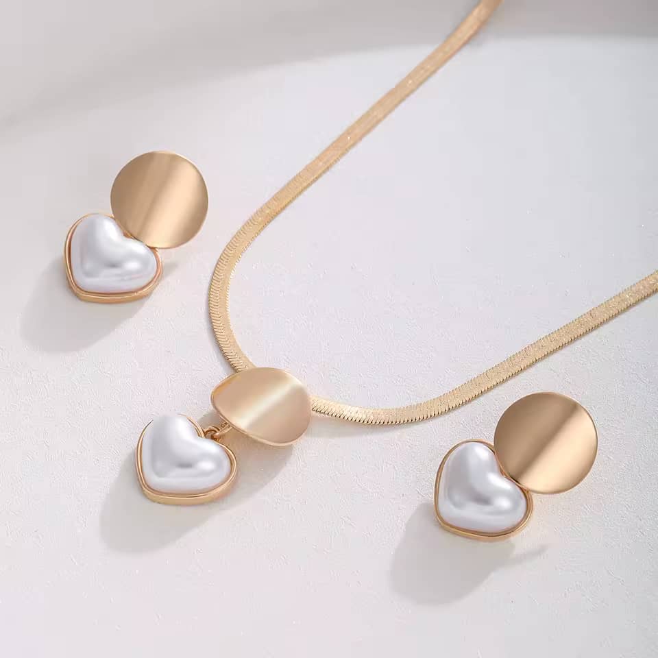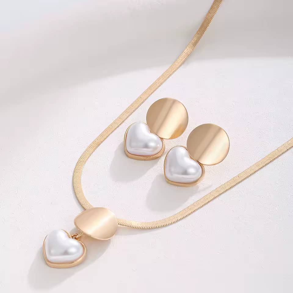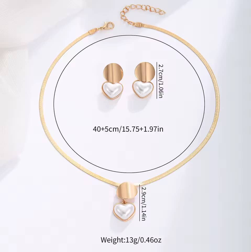 Add a charming touch to any outfit with this heart-shaped necklace and earrings set, featuring a glossy gold-plated finish.